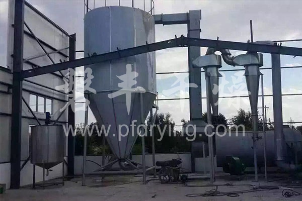 空氣經過過濾和加熱,進入干燥器頂部空氣分配器,熱空氣呈螺旋狀均勻地進入干燥室。料液經塔體頂部的高速離心霧化器,(旋轉)噴霧成極細微的霧狀液珠,與熱空氣并流接觸,在極短的時間內可干燥為成品。成品連續地由干燥塔底部和旋風分離器中輸出,廢氣由風機排空。
